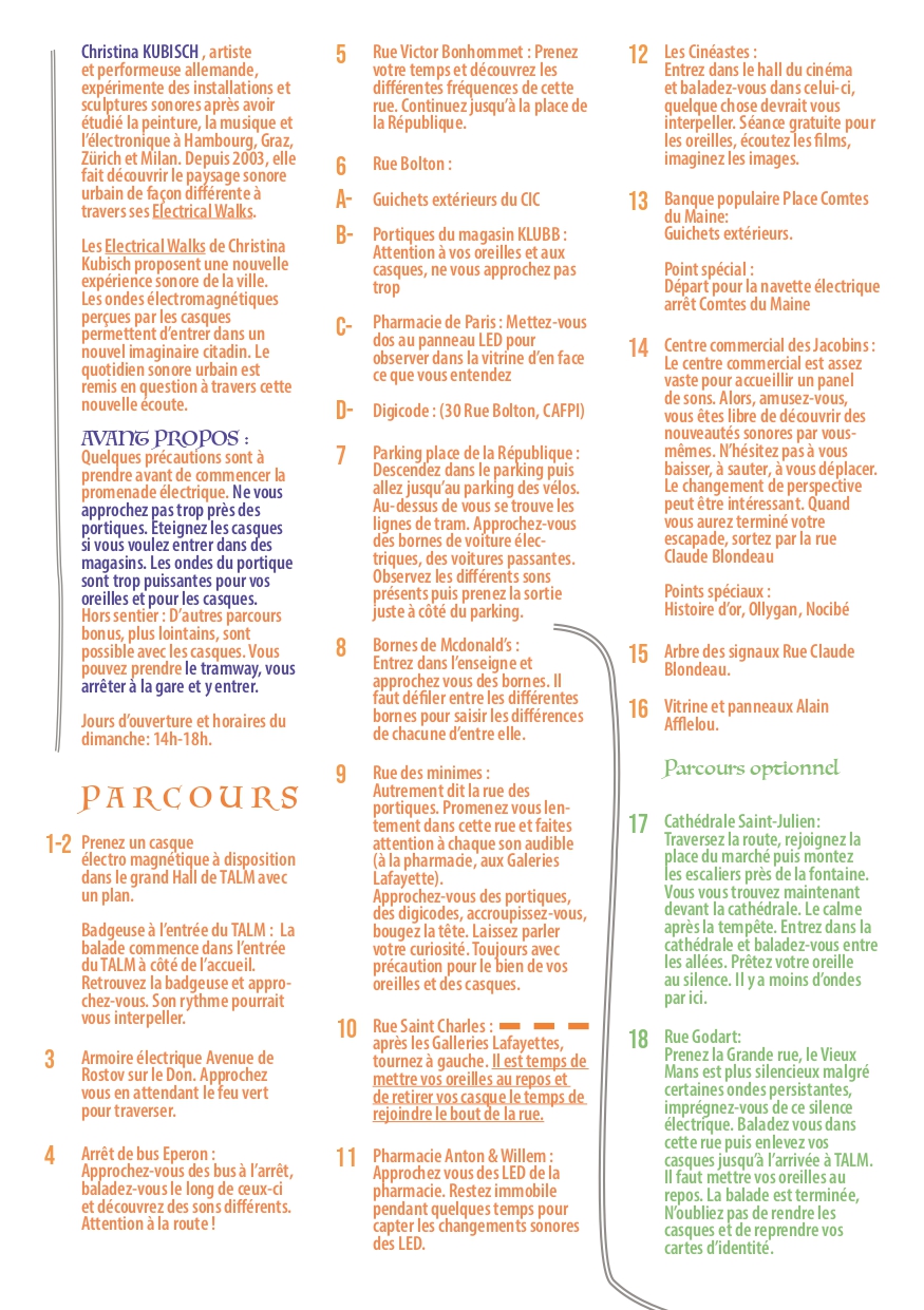 Participation à la création d’une nouvelle proposition d’Electrical Walks, poursuivant la série initiée par Christina Kubisch à travers le monde. Le projet consistait à concevoir une balade sonore dans la ville du Mans, révélant son univers inaudible: les sons électromagnétiques.